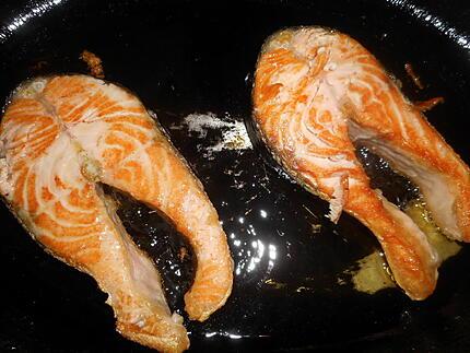 Recette darne de saumon poele. 4 pavés de saumon. à soupe dhuile dolive. Un peu de salamoia bolognese.